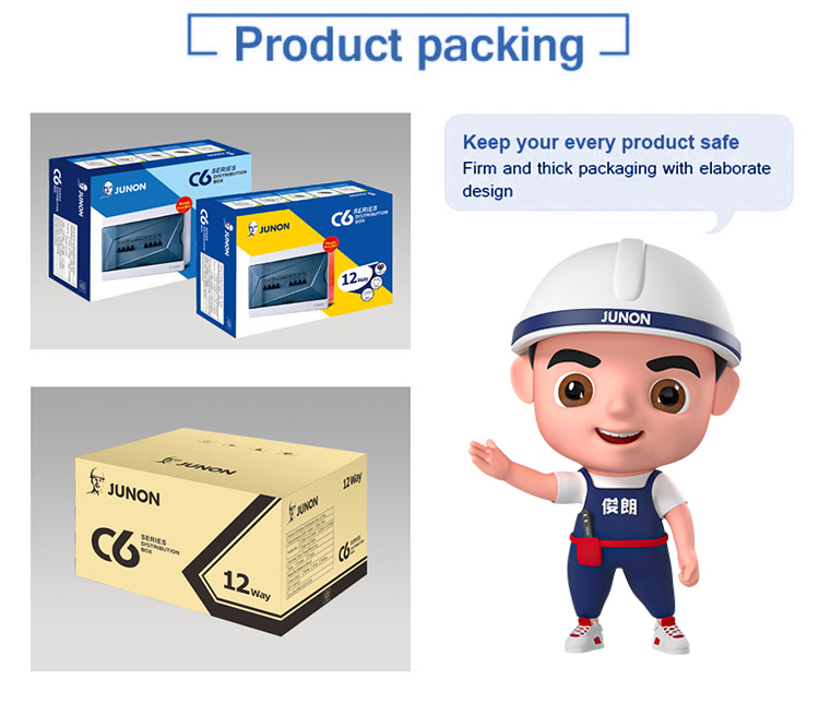 JUNON C6 series Flush type and Surface distribution boxes/distribution boards are mainly used in the circuit of AC 50Hz, rated voltage 220V/380V, and acted to install the modular combination equipment. It is widely used in the family, high building, house, station, port, airport, commercial house, hospital, cinema, enterprises and so on. The Big Plastic Boxes Flush type and Surface type distribution boxes adopts PC flame-proof material with the characteristics of flame-proof, impulse proof, excellent insulation property and so on.